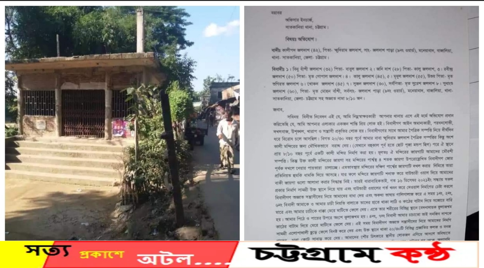 মোহাম্মদ জুবাইর চট্টগ্রাম। চট্টগ্রাম সাতকানিয়া থানাধীন বাজালিয়া পুরানগড় মনেয়াবাদ (৯নং ওয়ার্ড) জলদাশ পাড়া এলাকায় বহুদিনের পুরোনো কালী মন্দির ও তৎ সংলগ্ন জায়গা জমি জবর দখলের চেষ্টা প্রতিপক্ষকে মারধর,নির্মান সামগ্রী নষ্ট আরও পড়ুন